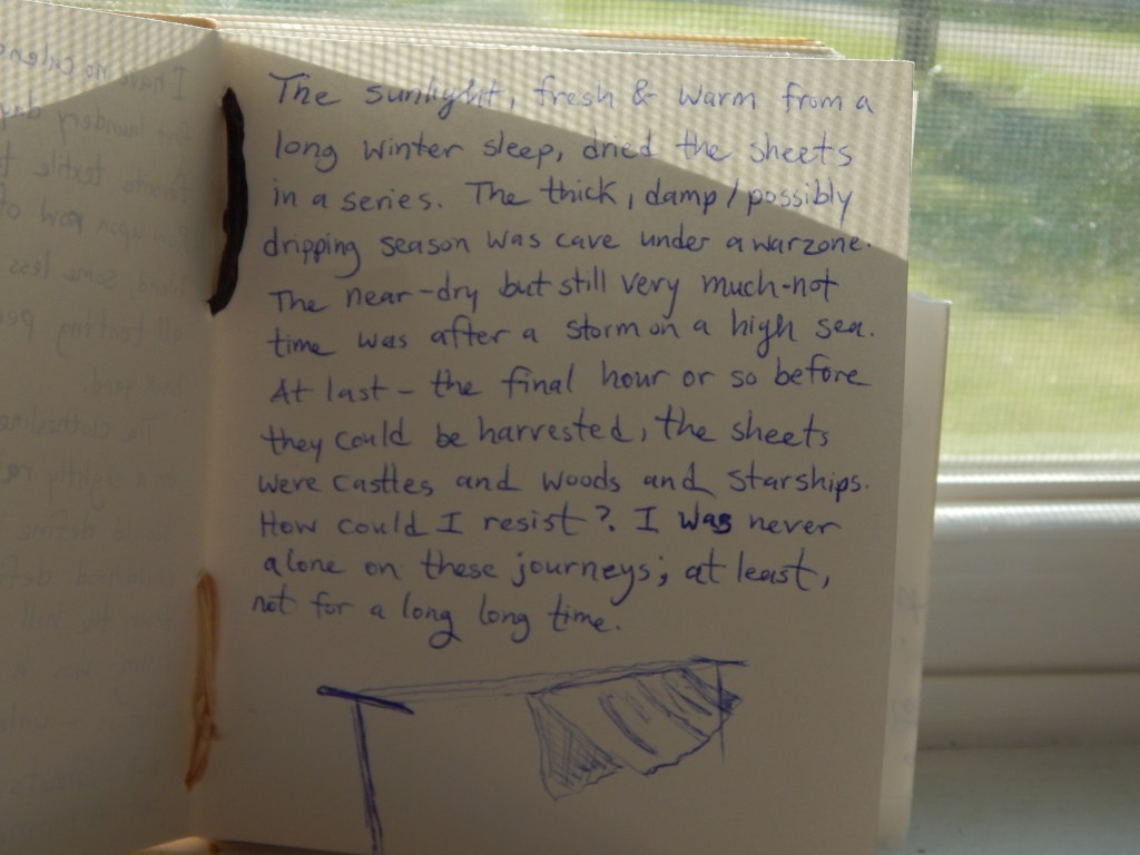 The sunlight, fresh & warm from a long winter sleep, dried the sheets in a series. The thick, damp/possibly dripping season was (a) cave under a war zone. The near-dry but still very much not time was after a storm on the high sea. At last – the final hour or so before they could be harvested, the sheets were castles and woods and starships. How could I resist? I was never alone on these journeys; at least, not for a long long time.