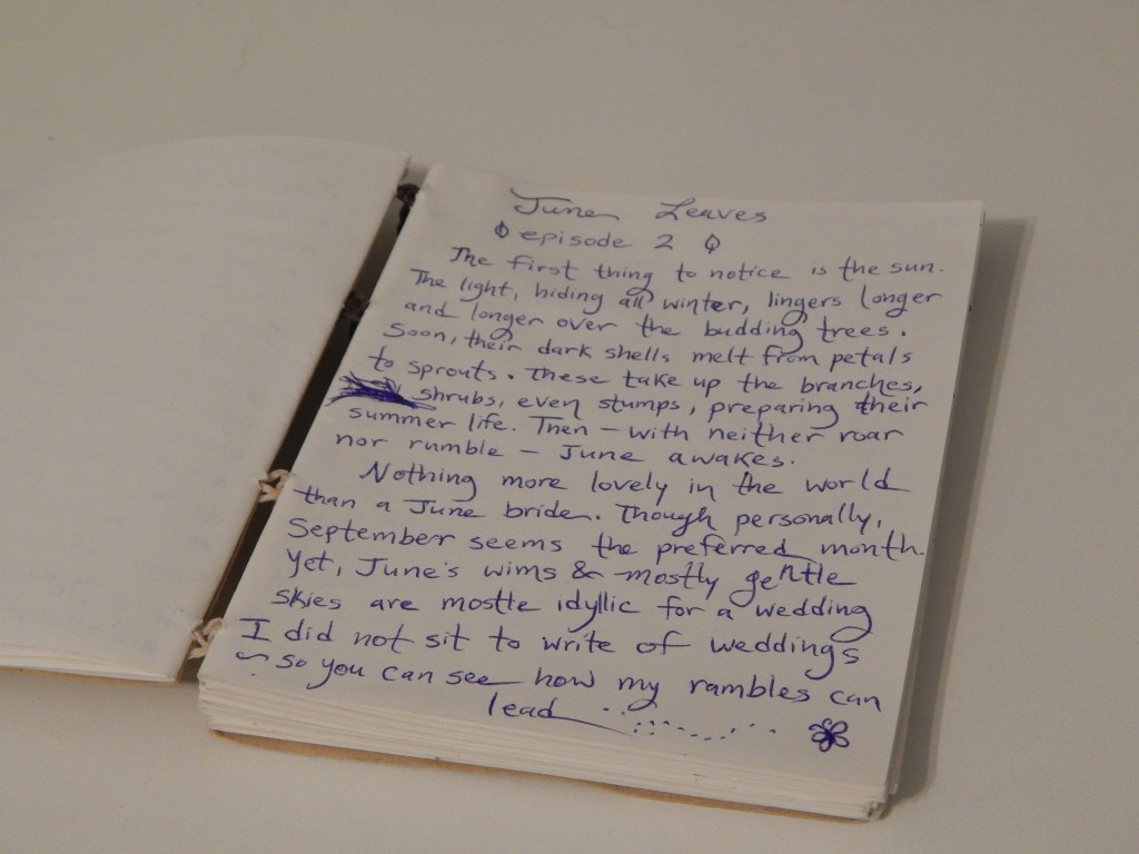 The hand bound note book is opened to another page, titled “Worthy of Mention, episode 1.” The window basks the entire journal in bright light as more blue script etches below.