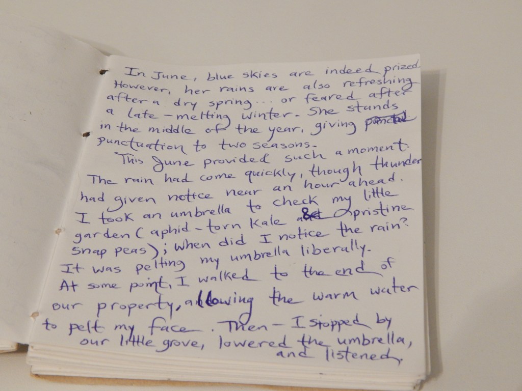 This June provided such a moment. The rain had come quickly, though thunder had given notice near an hour ahead. I took an umbrella to check my little garden (aphid-torn kale & pristine snap-peas); when did I notice the rain? It was pelting my umbrella liberally. At some point, I walked to the end of our property, allowing the warm water to pelt my face. Then – I stopped by our little grove, lowered the umbrella, and listened.